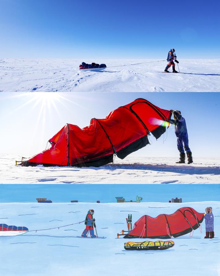 Szybko zwijam namiot i pakuję wszystkie rzeczy na sanie. Potem zakładam narty. W ciągu dwóch godzin pokonujemy 5 kilometrów. I nagle wiatr się uspokaja, śnieg nie wpada mi już za kołnierz, a pogoda robi się wyśmienita.