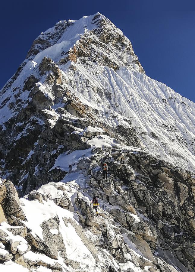 Trudności skalne kończą się tuż za obozem trzecim, ale za to przed nami mozolne podejście śnieżno-lodowe, aż do samego szczytu. Wreszcie robi się jasno i dookoła wyłaniają się przepiękne Himalaje, oświetlone ciepłym pomarańczowym blaskiem wschodzącego słońca. Niestety, grań południowo-zachodnia, którą idziemy jeszcze długo będzie zanurzona w cieniu góry.