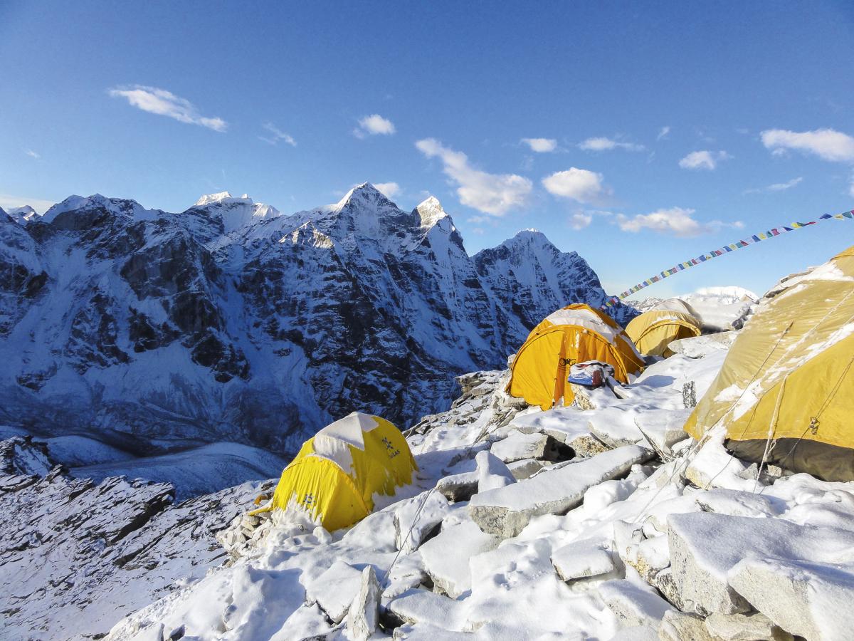 Po ośmiu dniach trekkingu i udanej aklimatyzacji na Kala Pattar (5643 m n.p.m.), docieram w końcu do bazy pod Ama Dablam. To dość spore pole, po środku którego płynie niespiesznie mały strumień. W tym roku jest dość tłoczno. Największym problemem będzie więc miejsce w obozach I i II, a nie pogoda, czy kondycja. Wygrywają ci, co są razem z Szerpami. Indywidualni wspinacze znajdują się na końcu listy do miejsca w jedynce czy dwójce. W tym pierwszym przypadku jest miejsce na góra 20 namiotów, w tym drugim tylko na pięć. A obozu trzeciego się już raczej nie ustawia ze względów bezpieczeństwa.