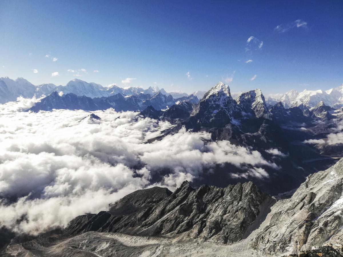 I nagle, góra wynagrodziła mi cały ten wysyłek, bo w jednej chwili wiatr prawie całkowicie cichnie, robi się niesamowicie ciepło, a przede mną wyłaniają się himalajskie kolosy. Widać Everest, Lhotse z jej południową ścianą, Makalu, Kanczendzongę, Czo Oju i całą masę innych siedmio- i sześciotysięczników. Robię zdjęcia jak szalona, nagrywam filmiki, jakbym bała się, że ktoś mnie zaraz obudzi i skończy się ta bajka.