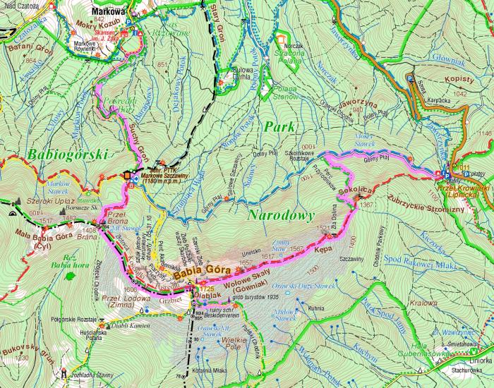 Maszerujemy przez Pośredni Bór wzdłuż szumiących wód Marków Potoku. W jego dolinie rośnie symbol BgPN okrzyn jeleni, charakterystyczna roślina z rodziny selerowatych. Pół godziny później przekraczamy ciek drewnianą kładką. Teren staje się coraz bardziej stromy i teraz słychać głównie grupową zadyszkę. Kilkaset metrów dalej przechodzimy przez most z bali. Za nim skrzyżowanie ścieżek, na którym skręcamy w prawo podążając za zielonymi znakami. Prosto poszlibyśmy Dolnym Płajem, obecnie niedostępnym dla turystów. Wspinamy się w górę na urokliwą Kolistą Polanę, gdzie w latach 60. miał powstać Dom Turysty im. Lenina z prowadzącą do niego koleją linową. Na szczęście dzięki protestom przyrodników i babiogórskich działaczy zrezygnowano z tych planów.