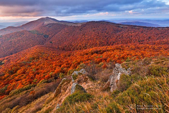 Wróćmy jednak do buków, głównej naturalnej atrakcji Bieszczadów w jesiennym wydaniu. Wiemy już, że pokrywają one przede wszystkim górne strefy górskich lasów, w związku z czym wspaniale prezentują się nie tylko z perspektywy szczytów gór, ale i z dolin. Leżąc pomiędzy płowymi dywanami traw połonin a lasami i zaroślami „krainy dolin”, wyróżniają się zdecydowanym, czerwono-ceglastym zabarwieniem. To jest właśnie ten widok, dla którego warto tu przyjechać.