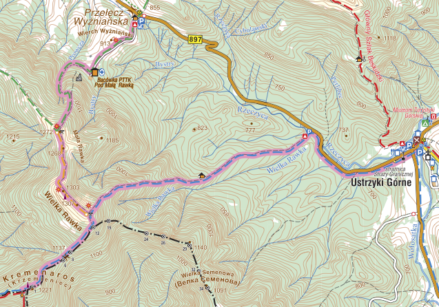 Przejście z Ustrzyk Górnych na Przełęcz Wyżniańską. Następnie opisany w tekście szlak przez Rawki na Kremenaros.