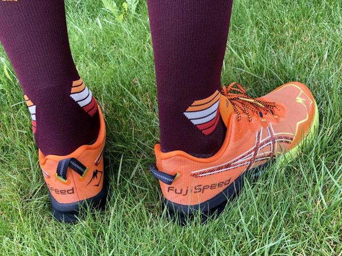 W porównaniu do pierwszej wersji FUJISPEED dostajemy lepiej zabezpieczone palce (nie będą Wam straszne uderzenia o kamienie czy wystające korzenie), klasyczne sznurowanie versus system linkowy (polecam parę razy przesznurować buty, zrobić w nich kilka zbiegów i dopasować odpowiedni poziom ucisku sznurówek) i co mnie zaskoczyło najmilej – bardzo miękki zapiętek. Jest bardzo wygodny, praktycznie nie wymaga rozbiegania czy też dopasowania. Dlatego już po pierwszym założeniu FUJISPEED 2 można od razu wybiec na dłuższy trening bez ryzyka obtarć czy odcisków. Dodając do tego wszyty, zintegrowany język (chroni przed wpadaniem kamieni czy piasku) oraz bardzo cienką, niewyjmowaną wkładkę (dużo lepsze czucie podłoża i dopasowanie stopy w cholewce) – dostajemy istnego potwora do bicia rekordów życiowych na trailowych trasach.