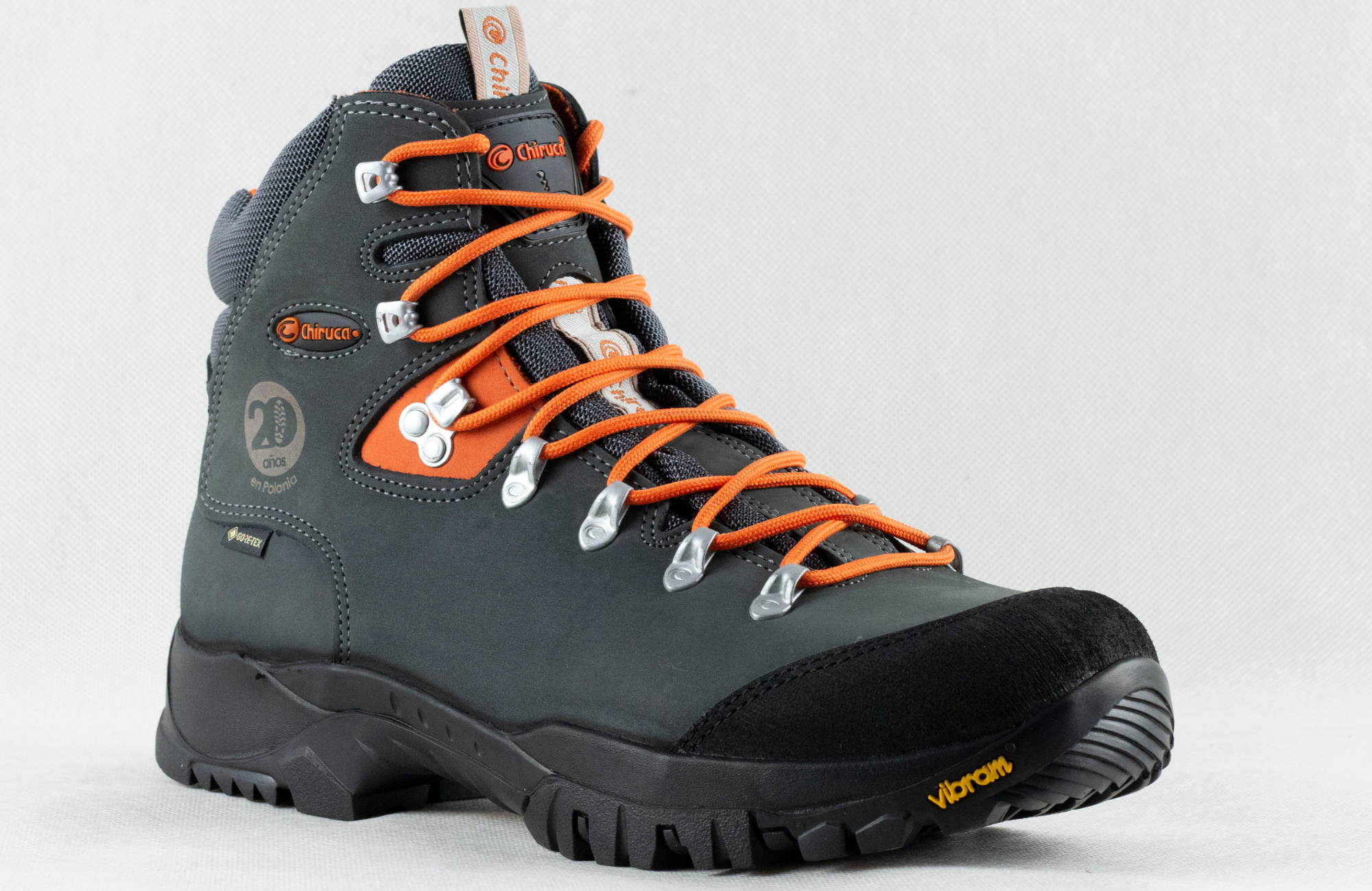 Jeden z najbardziej wszechstronnych modeli, przygotowany z okazji 20-lecia obecności marki Chiruca w Polsce. Cholewki są wykonane z hydrofobizowanego nubuku i cordury o zwiększonej odporności na zabrudzenia. Miechowe języki ułatwiają dopasowanie butów i zabezpieczają przed wpadaniem kamieni. Buty są specjalnie wzmocnione na piętach i palcach. Membrana Gore-Tex zapewnia wodoszczelność z jednoczesnym odprowadzaniem potu, co wydatnie poprawia komfort nawet w ciepłe dni. Podeszwy Vibram Fusion CNR gwarantują bardzo dobrą przyczepność. Anatomiczne wkładki poprawiają wygodę i usprawniają transport wilgoci na zewnątrz butów. Rozmiary: 37-46. Waga: 670 g