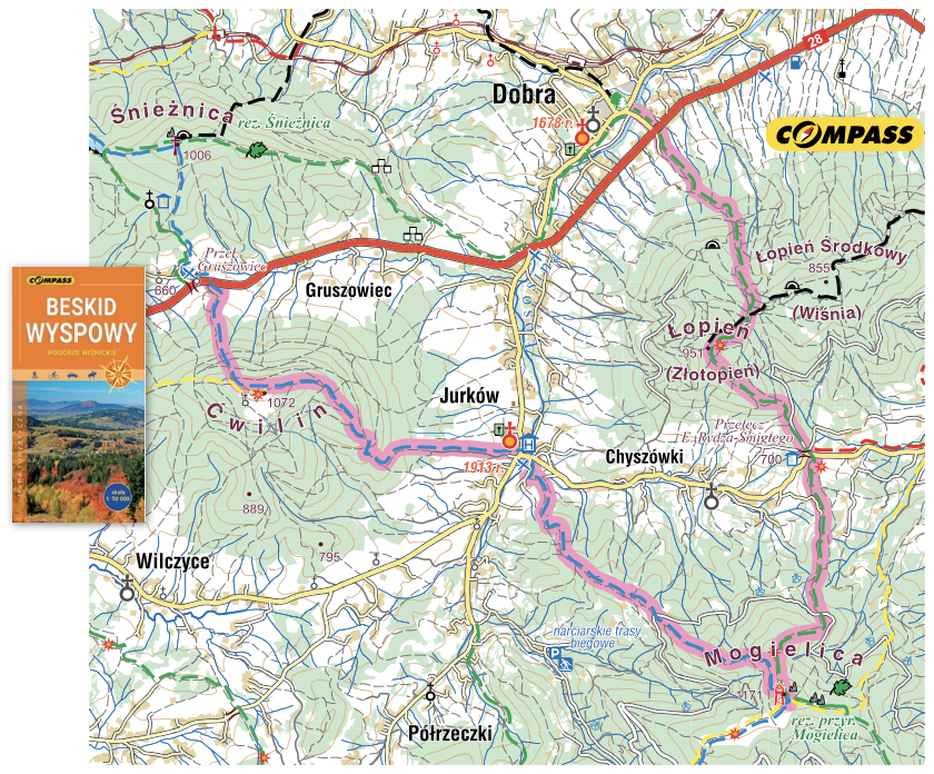 Opisany w tekście szlak z przełęczy Gruszowiec na Ćwilin, Mogielicę i Łopień z zejściem do Dobrej.