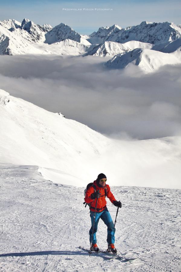 Uwielbiam też w górach zimę, będąc rzecz jasna świadom wszystkich zagrożeń, jakie czyhają tu na nas o tej porze roku. Dziś jest jednak pięknie – pogoda stabilna, warunki do chodzenia bardzo dobre. Oczywiście na grani, kiedy słońce weszło już wyżej, śnieg nie jest już tak fajnie zmrożony. Nie zabiera to jednak frajdy poruszania się w nim.