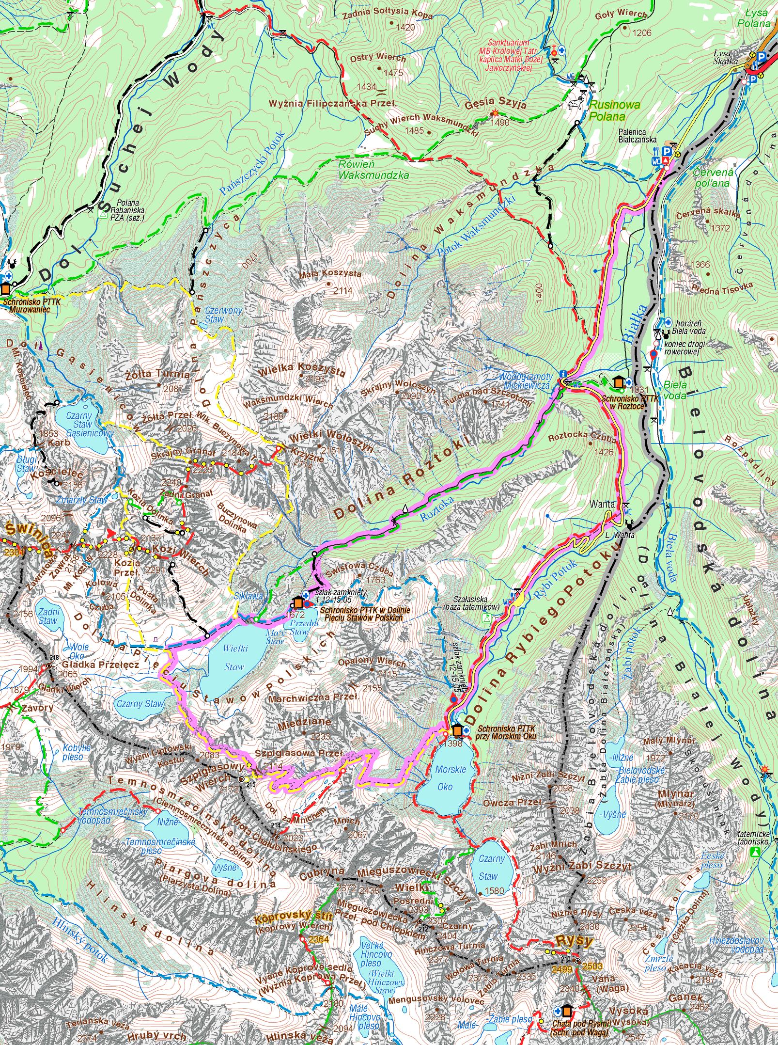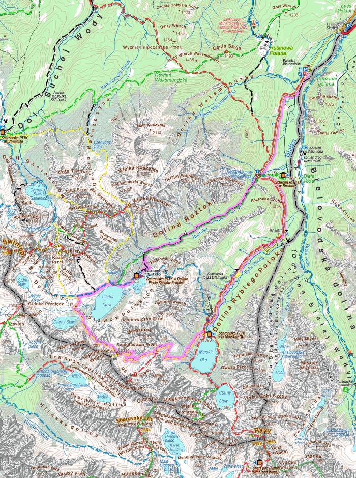 Do Doliny Pięciu Stawów Polskich najszybciej można dojść Doliną Roztoki od Wodogrzmotów Mickiewicza, znajdujących przy Drodze Oswalda Balzera prowadzącej nad Morskie Oko. Inni docierają tam z Hali Gąsienicowej przez Zawrat albo przez Świstówkę Roztocką znad Morskiego Oka. Ja najchętniej idę do tej wysokogórskiej doliny przez Szpiglasową Przełęcz, wcześniej mijając Morskie Oko. By jak najwcześniej podziwiać górskie krajobrazy z tatrzańskimi stawami.