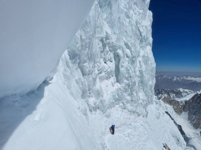 Ruszam, bardzo powoli, bo inaczej się nie da, skupiając się na każdym kroku, który na tej wysokości jest nad wyraz ciężki do wykonania. Niebezpieczne przejście pod olbrzymim serakiem, czyli tzw. Szyjka Butelki, wymaga szczególnej koncentracji, bo łatwo stoczyć się w dół, a ścieżka jest na szerokość dosłownie jednej stopy. Ale i tak gorsza okazuje się lodowa ścianka, na której przy pierwszej próbie odpadam. Zbyt płytko wbite przednie zęby raków ześlizgują się i chwilę potem, z sercem w gardle, zawisam na linie, mając pod sobą przepaść.