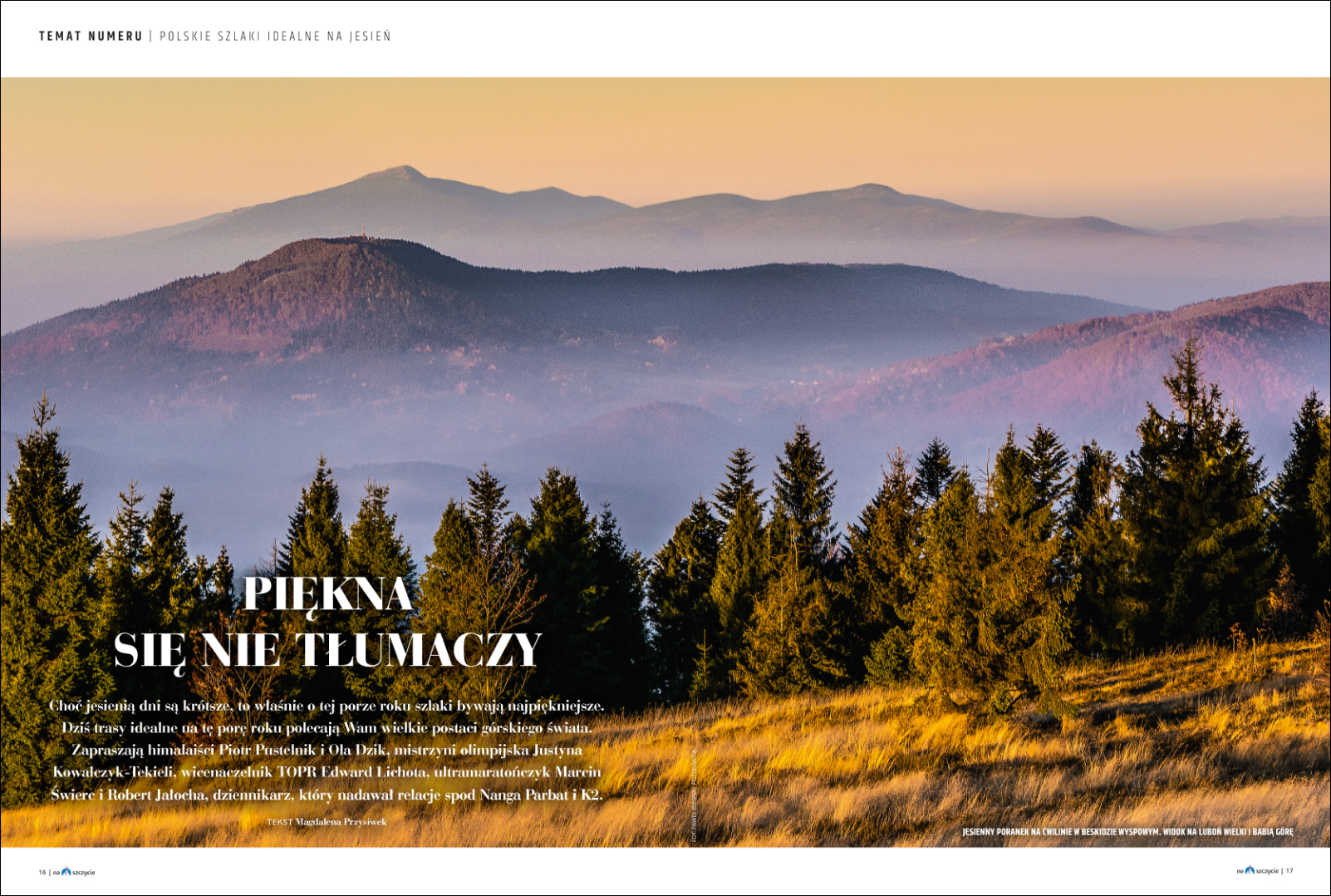 Po raz kolejny w tym roku zapraszamy Was na polskie szlaki. A robimy to naprawdę w doborowym towarzystwie. Trasy idealne na jesień rekomendują specjalnie dla Was, zdobywca Korony Himalajów i Karakorum Piotr Pustelnik, mistrzyni olimpijska w narciarstwie biegowym Justyna Kowalczyk i wicenaczelnik TOPR Edward Lichota, a także Śnieżna Pantera Ola Dzik, ultramaratończyk Marcin Świerc i dziennikarz Robert Jałocha, który nadawał między innymi z bazy pod K2.