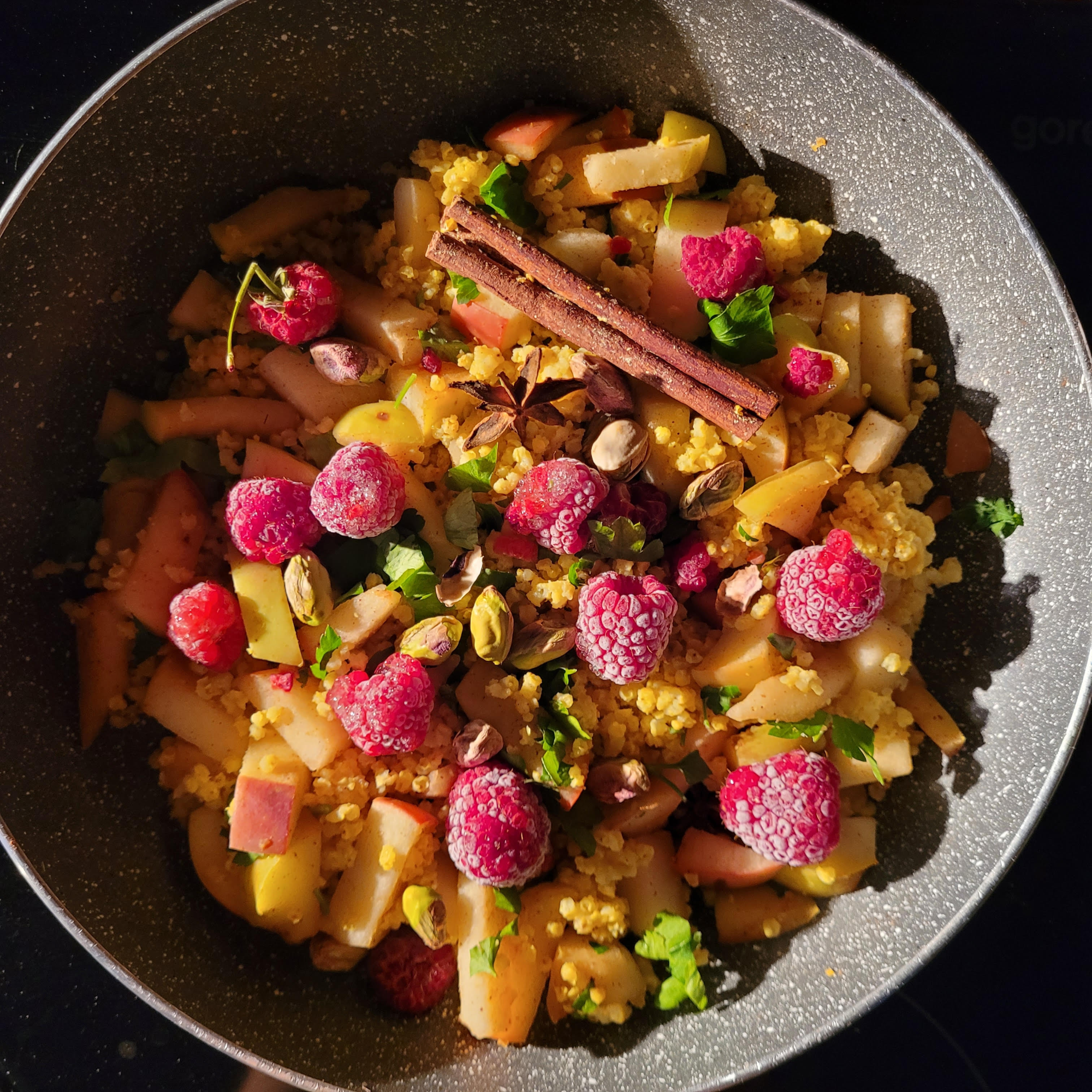 Kaszę jaglaną najpierw płuczę w garnku i gotuję na sypko, w odpowiednich proporcjach i na wodzie z dodatkiem cynamonu, kardamonu, anyżu – bez soli. A że jest bogata w białko, to nie ma potrzeby gotowania jej na mleku.