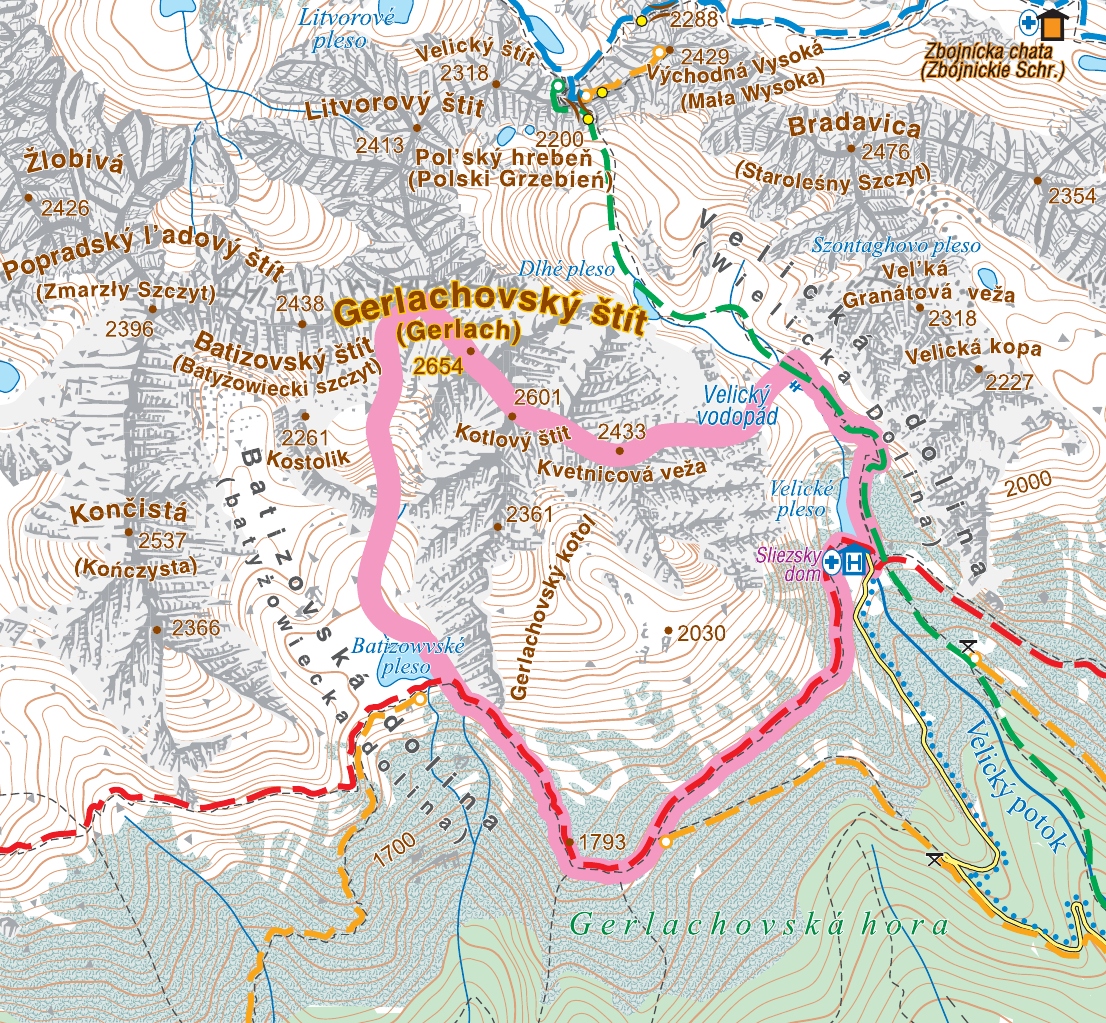 Wciąż zdobywamy wysokość i po kilku minutach znajdujemy się na wypłaszczeniu, które nazywane jest Wielickim Ogrodem (słow. Kvetnica). Żyzna gleba, którą pozostawiło jezioro morenowe, stworzyła dobre warunki dla wielu rosnących tutaj ziół. Kilometr od Śląskiego Domu schodzimy wreszcie ze znakowanego szlaku. Przekraczamy potok i podążamy w stronę majaczących we mgle piarżysk, pod wschodnimi zerwami Gerlacha. Umówiliśmy się z przewodnikiem na klasyczny wariant przejścia: wchodzimy przez Wielicką Próbę, a schodzimy Batyżowiecką Próbą.