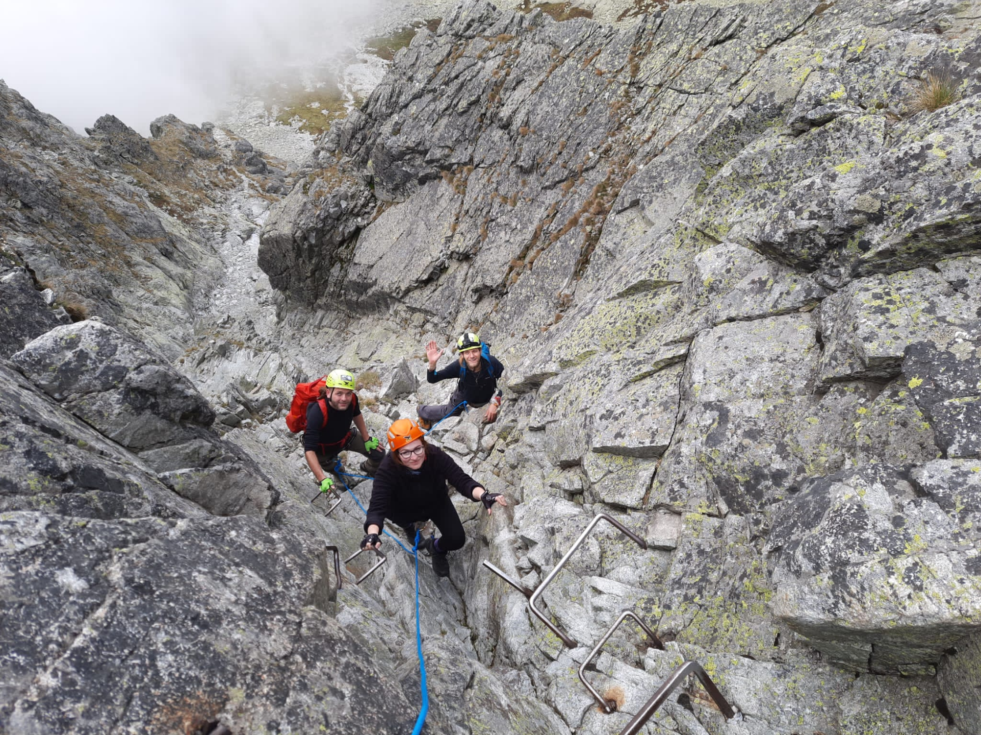 Gerlach na razie nie chce się wyłonić zza chmur, ale mamy nadzieję, że kiedy znajdziemy się wyżej, to jednak się przejaśni. Poza kontaktem z przyrodą, w górach najważniejsze są przecież widoki. Ruszamy zatem wzdłuż Wielickiego Stawu i dalej wciąż za znakami zielonymi, które prowadzą piętrami Wielickiej Doliny na Polski Grzebień (2200 m n.p.m., Poľský hrebeň). Śmigamy pod słynnym skalnym okapem, który zyskał określenie Wieczny Deszcz, bo nieustannie ciurka z niego woda.