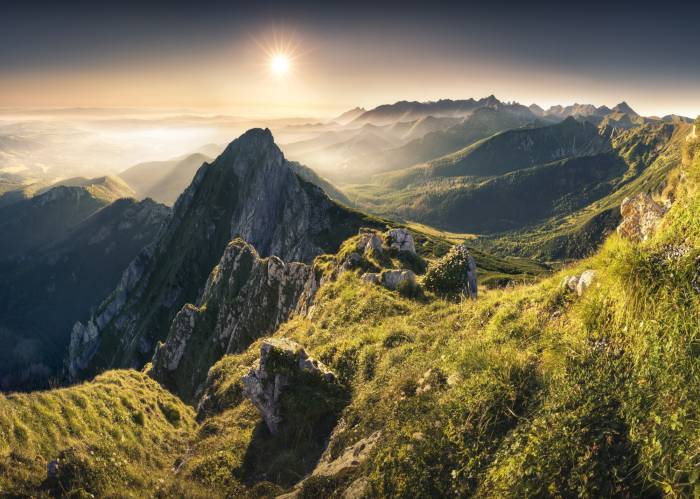 Widok z Giewontu na Dolinę Kondratową, w tle m. in. Świnica, Wielka Koszysta i Rysy. Zdjęcie Karol Nienartowicz