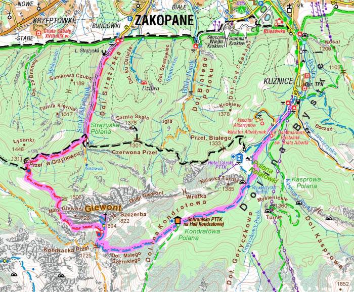 czerwony, niebieski: Dolina Strążyska (parking) – Polana Strążyska – Przełęcz w Grzybowcu – Wyżnia Kondracka Przełęcz – Giewont 3 h 15 min ↑ 2 h 30 min ↓