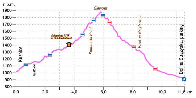 niebieski: Kuźnice – Polana Kalatówki – Hala Kondratowa – Przełęcz Kondracka - Giewont 3 h 30 min ↑ 2 h 40 min ↓