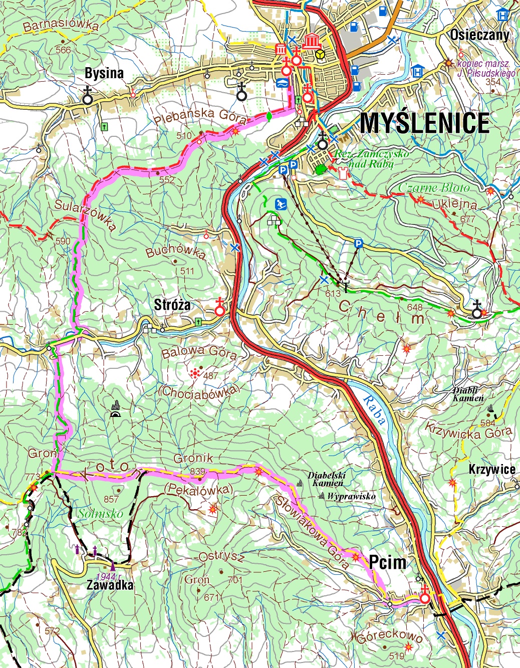 czerwony: Sularzowa - Myślenice: 1 h 30 min ↓ 2 h ↑