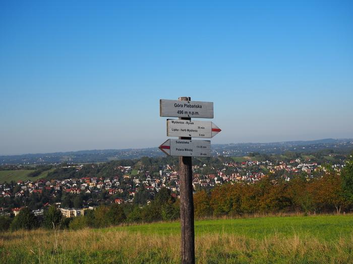 Podchodzę na Plebańską Górę (495 m n.p.m.), która jest popularnym celem spacerowych wycieczek mieszkańców Myślenic. Dlatego spotykam tu dużo więcej ludzi niż w czasie całej dzisiejszej trasy, ale zupełnie mi to nie przeszkadza. Dookoła mnie zacna panorama. Na południowym wschodzie wznosi się Uklejna (680 m n.p.m.), obok niej Chełm (614 m n.p.m.) z wieżą widokową (wstęp płatny) oraz krzesełkową kolejką linową, jedną z najdłuższych w Polsce. Liczy bowiem ponad 2 km. Dalej na wschodzie zwraca też uwagę Grodzisko (618 m n.p.m.) będące fragmentem pasma Cietnia. Jak nazwa wskazuje, na szczycie stała niegdyś średniowieczna warownia. Na lewo od niego widać pogórzańskie Pasmo Glichowca. Z kolei na północy prezentuje się Dalin w Paśmie Barnasiówki zaliczanym przez geografów do Pogórza Wielickiego. W północno-wschodniej części krajobrazu widoczne jest też Jezioro Dobczyckie.