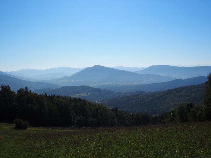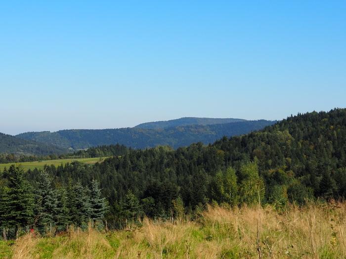 Wracam na szlak i po około 20 minutach trafiam na polanę z samotnym domostwem. Teren wznosi się do granicy lasu skąd podziwiam imponujący widok na wschód. Beskid Wyspowy reprezentują Śnieżnica, Ćwilin oraz trapezowata Lubogoszcz. Na prawo od niej imponujące wrażenie robi nieodłączna para - wybitny Szczebel oraz Luboń Wielki z charakterystycznym masztem. Zza długiego grzbietu Lubonia Małego dumnie wznoszą się świetnie tego dnia widoczne Tatry Wysokie. Panoramę uzupełniają wspomniane już wcześniej gorczańskie szczyty, do których teraz dołączył Turbacz, a także m.in. Solnisko i Obidowiec. Panorama zachęca, by zrobić tutaj przerwę śniadaniową.