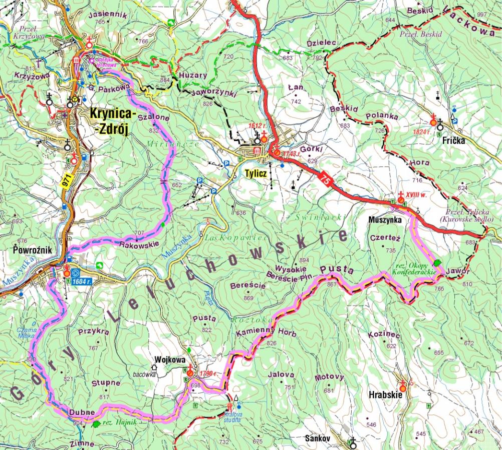 żółty: Garby – Wojkowa – Muszynka 5 h 30 min. ↓ 5 h 50 min ↑