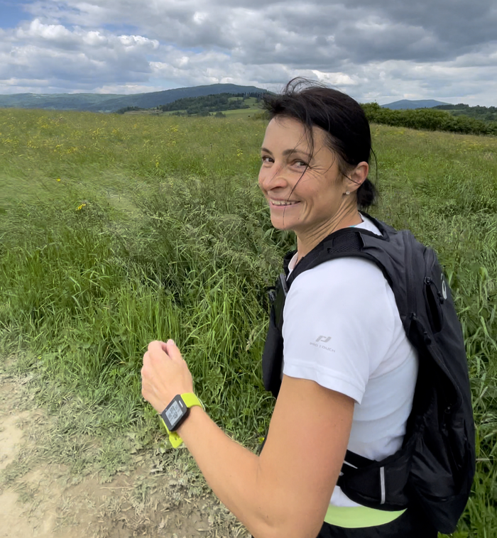 Schodzimy do Rabki. Na ostatniej prostej przed zabudowaniami miasteczka spotykamy na treningu znaną polską biegaczkę górską, Dominikę Bolechowską. Desperacko podejmuję próbę, aby ją dogonić, w końcu to mistrzyni. Wyciągam telefon, mikrofon i ledwo dotrzymując tempa rejestruje strzępy wypowiedzi.