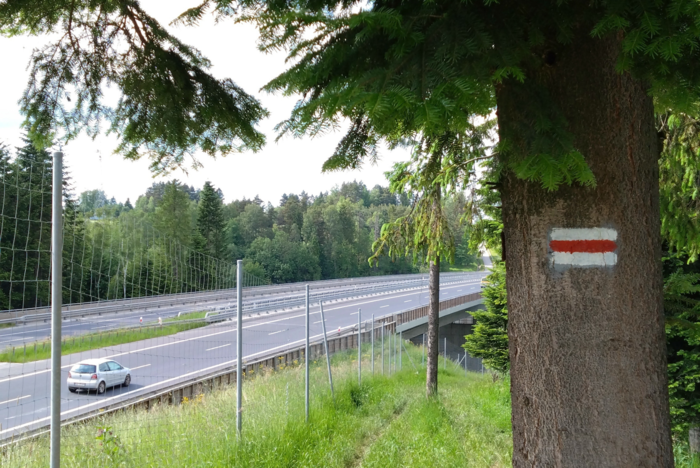 Gdy opuszczamy malowniczą polanę, zatrzymuje nas płot nowego odcinka zakopianki. Idąc wzdłuż niego, schodzimy w dół pod pokaźny wiadukt. Wygląda to prawie jak w Nowym Jorku. Z tą różnicą, że dookoła jest zielono, a budowla to świeży beton, a nie stalowe konstrukcje. Dwie nitki zakopianki dają w tym miejscu sporą przestrzeń ochronną. Bezpiecznie można się tu schronić podczas deszczu, a nawet zabiwakować, choć nie wiem czy byłoby to do końca legalne.