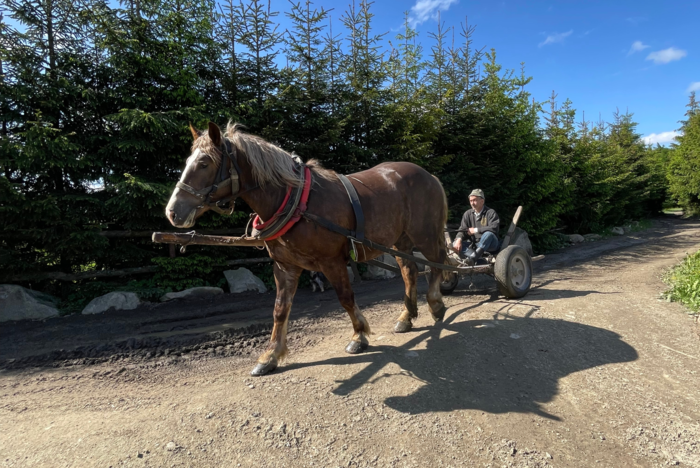 Celebrujemy wspólnie miły początek dnia. Zajadamy się wykwintnym daniem – trzy parówki, dwie kromki chleba, musztarda i ciepła herbata. „Wierzynek” z Rynku w Krakowie może się schować. Niestety, widoków z polany przed schroniskiem nie uświadczamy. Jest natomiast koń z furką. To ostatnio dość rzadki widok. Kiedyś nie było to nic wyjątkowego, nawet w mieście. Dziś przywołuje miłe wspomnienia z dzieciństwa.