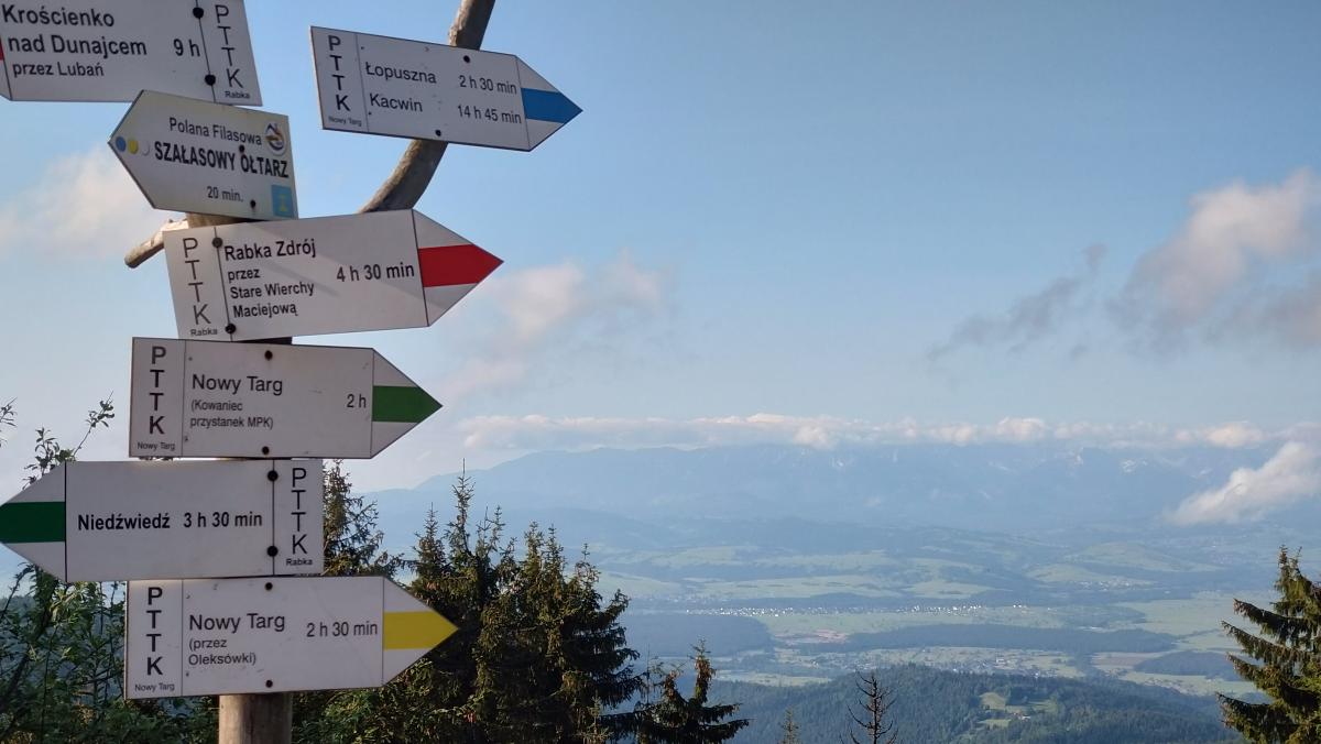 Szlakowskaz przed Schroniskiem PTTK na Turbaczu. Fot. Andrzej Otrębski