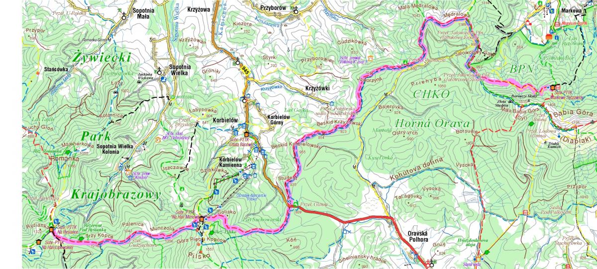Kolejne kuszenie już blisko, bo za 2 km. Oto bowiem na Przełęczy Jałowieckiej (1010 m n.p.m.) zaczyna się żółty szlak, którym można obejść Mędralową. Wiedzie przez Słowację i kiedyś, gdy swobodne przekraczanie granic było fikcją, dla niektórych piechurów - chcących skrócić trasę w kierunku Babiej Góry - fundował dreszczyk emocji. Nie pójdziemy jednak tą drogą, jak mawiał klasyk, bo wtedy nie moglibyśmy się tytułować zdobywcami Głównego Szlaku Beskidzkiego. Tyle kilometrów z Bieszczadów by poszło na zmarnowanie…