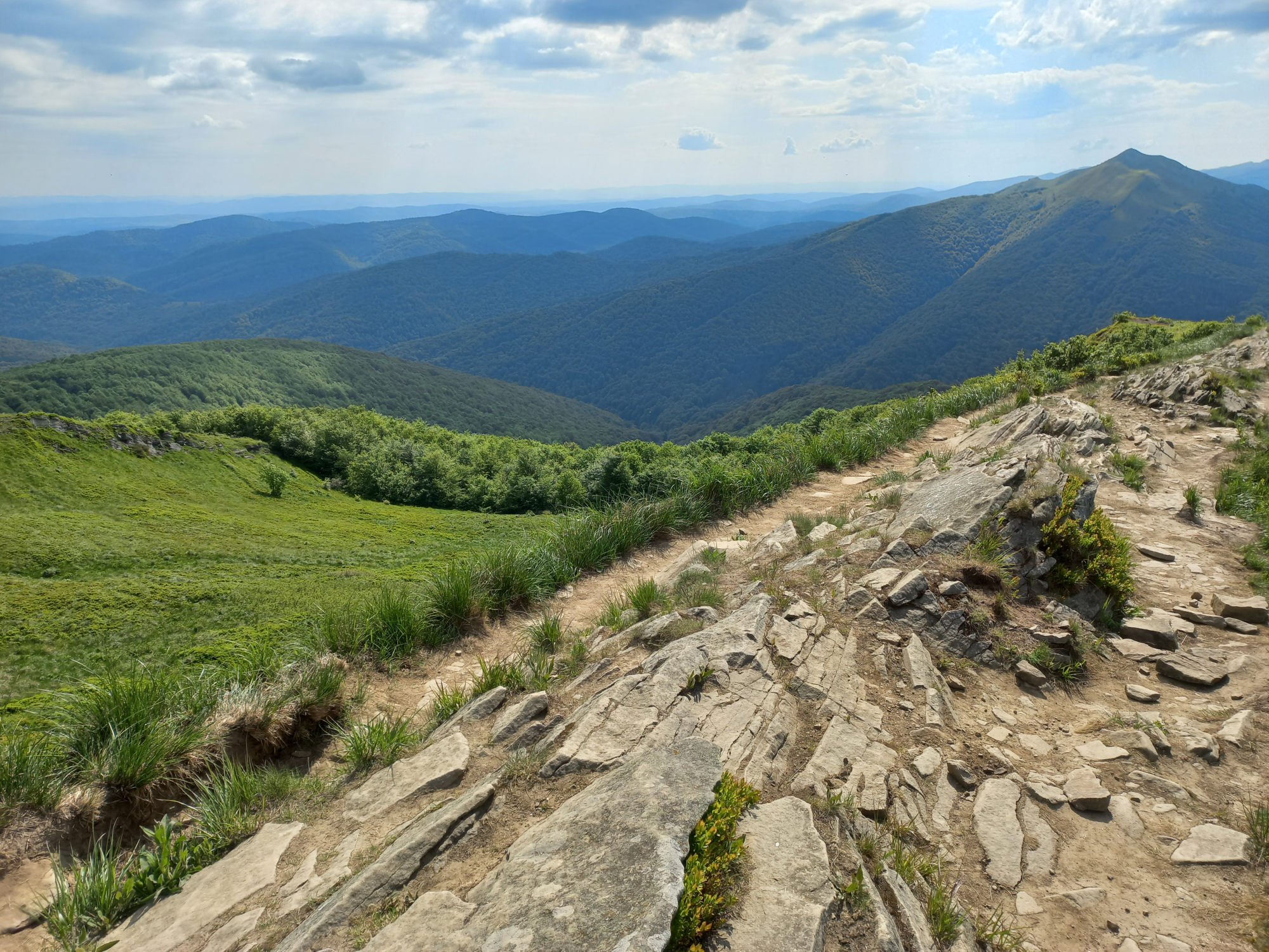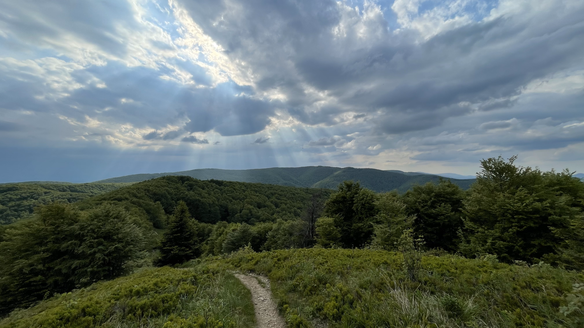 Przed nami niemal 500 metrów podejścia do Fereczatej (1102 m n.p.m.), ale warto się wysilić, bo wyłania się widok na słowackie Bieszczady. Chwilkę później idziemy szerszą ścieżką z licznymi punktami widokowymi. Oprócz nas nie ma nikogo.