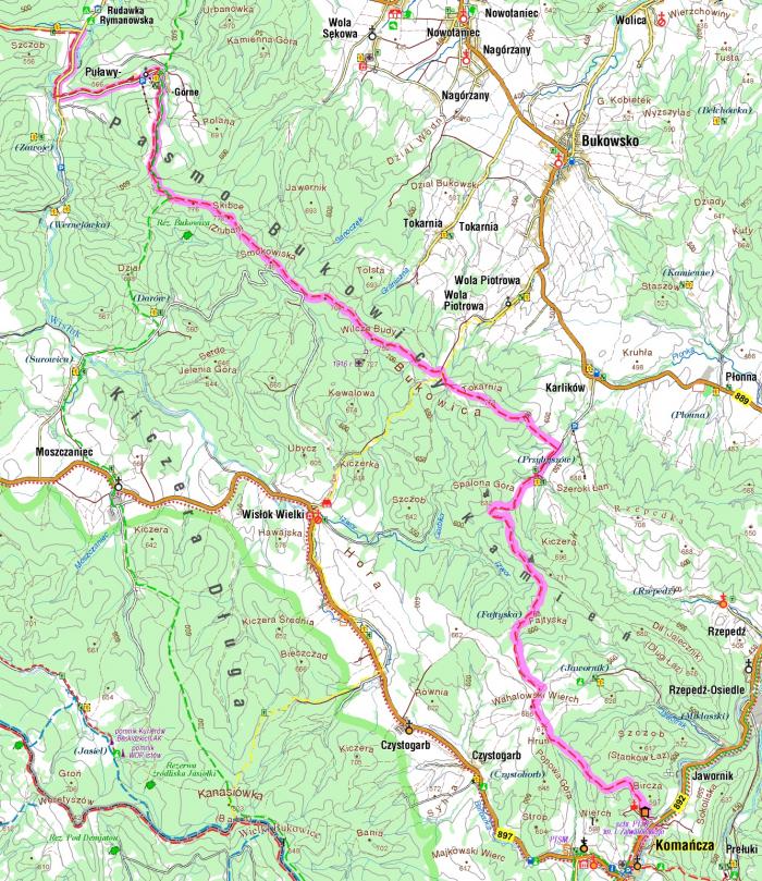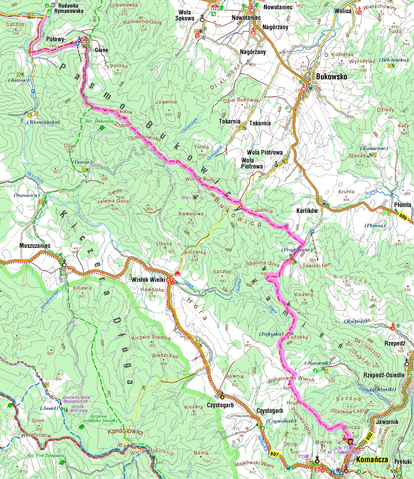 Asfalt: ok. 1,4 km podejście z Komańczy do schroniska niedaleko klasztoru; ok. 4 km z Puław do Rudawki Rymanowskiej (Tarnawki)