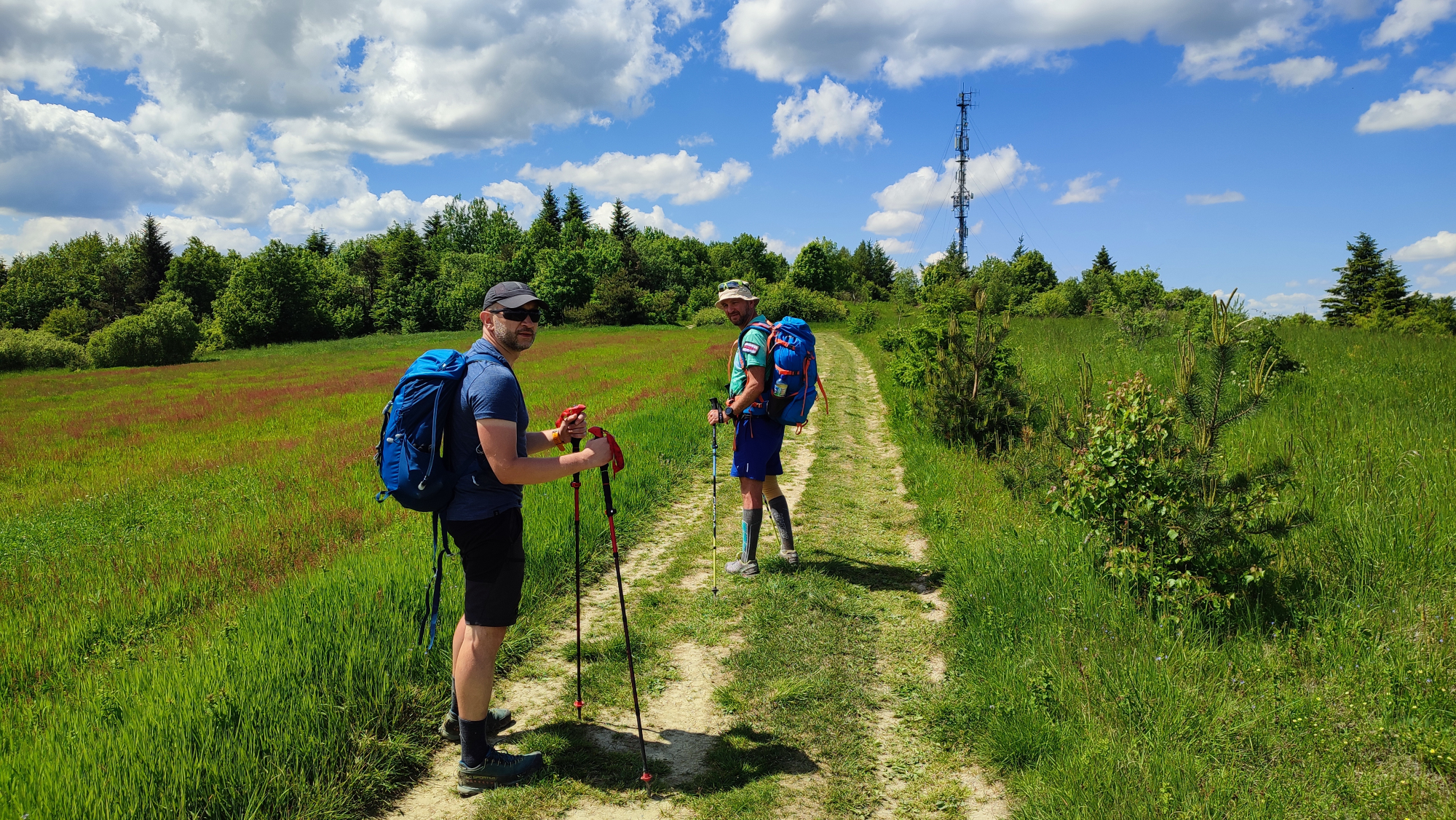 Z Komańczy (ok. 460 m n.p.m.) ruszamy kilka minut po godz. 8. Razem ze mną idzie serdeczny druh Daniel i dobrze Wam już znany Kuba Gdynia z Zabrza – tak, ten od „jadymy durś”. Jest gorący, niedzielny poranek czerwcowy. Moje powitanie z górami jest najgorsze z możliwych, bo na „dzień dobry” to prawie półtora kilometra asfaltu. Ale nie narzekam - wystarczy świadomość, że jestem w górach. Nawet liche jak na razie widoki – tylko zalesione wzgórza wokół – nie psują nastroju.