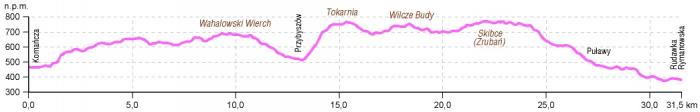 Po kwadransie schodzimy. Teraz idziemy grzbietem – czasem lasami, czasami łąkami - bez większych przewyższeń. Przechodzimy przez nieoznaczone wzniesienia, jak Wilcze Budy (759 m n.p.m.) i Skibce (776 m n.p.m.), by rozpocząć długie zejście w pełnym słońcu do samych Puław. Proszę tu jednak nie szukać posiadłości Czartoryskich, bo to nie te Puławy. Ale co nabraliśmy naszą koleżankę z Lubelszczyzny, wysyłając MMS-a z tablicą, to nasze.