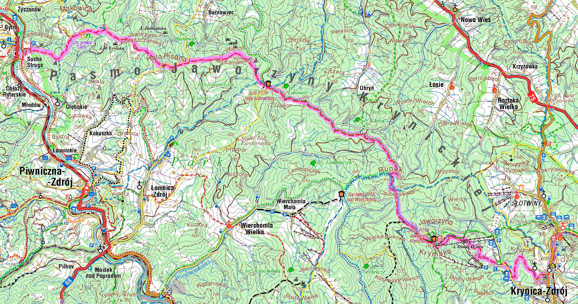 Dziewiąty dzień sztafetowego przejścia Głównego Szlaku Beskidzkiego to trasa z Krynicy-Zdroju do Rytra już w Beskidzie Sądeckim. Dziś mamy do pokonania prawie 32 km. Zaczynamy klasycznie od stromego podejścia na Jaworzynę Krynicką (1114 m. n.p.m.) – najwyższy punkt dzisiejszej wędrówki. Dalsza trasa powinna być już w miarę płaska, a potem tylko z górki. Wydaje nam się zatem, że spędzimy ten dzień na przyjemnym dreptaniu i delektowaniu się widokami.