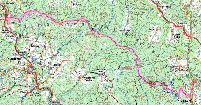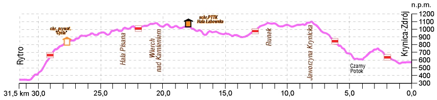 Asfalt: ok. 2,5 km w Krynicy-Zdroju, ok. 1,5 km w Rytrze – łącznie ok. 4 km