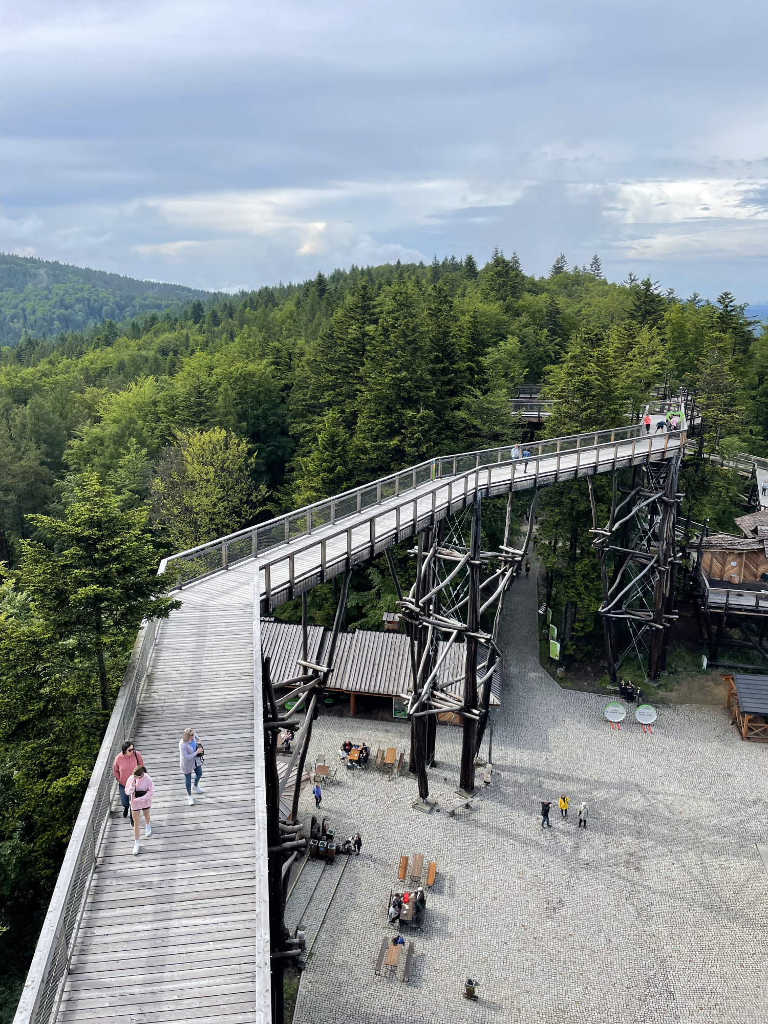 Po około 8-kilometrowej wędrówce, docieramy na szczyt Jaworzyny Krynickiej (1114 m n.p.m.) - to najwyższy dziś punkt na trasie. Prawie 600-metrowe podejście dało nam się dobrze we znaki. Momentami było stromo i ślisko, ale panoramy na Beskid Niski, jakie teraz się przed nami rozpościerają, wynagradzają włożony trud. Jeszcze więcej krajobrazów można podziwiać z dostępnej platformy widokowej 360 stopni o długości 124 metrów. Zlokalizowano ją nad górną stacją kolejki gondolowej, która prowadzi tutaj z Doliny Czarnego Potoku. Na każdym rogu platformy umieszczono lunetę wraz z opisami gór i wzniesień. Widać stąd Beskid Niski i Bieszczady, Połoninę Rivną i Góry Czerchowskie, a także Tatry Niżne, Wysokie i Bielskie oraz Zachodnie, a wcześniej Małe Pieniny. Wejście na taras jest płatne (10 zł), ale duży plus to całoroczna dostępność i przystosowanie dla osób z niepełnosprawnościami. Dla najmłodszych z górnego poziomu platformy przygotowano kilkunastometrową zjeżdżalnię grawitacyjną.