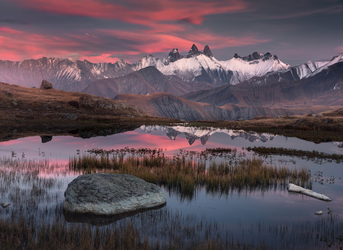 Paradoksalnie najdoskonalszy widok na cały masyw Aiguilles d’Arves rozciąga się z położonego zaledwie 10 minut od dostępnej samochodem przełęczy Col de la Croix de Fer (2068 m n.p.m.) jeziora Guichard. Nie mam wątpliwości, że spojrzenie na Igły znad tafli wody to jeden z najdoskonalszych widoków w całych Alpach!
