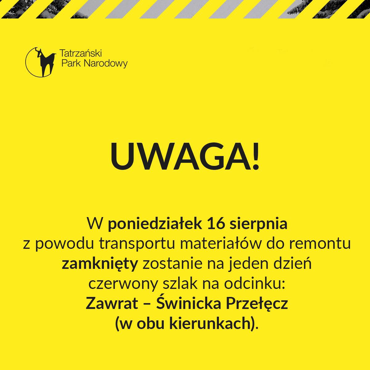 W poniedziałek, 16 sierpnia zostanie zamknięty na jeden dzień odcinek Zawrat – Świnicka Przełęcz (w obu kierunkach). W tym dniu zamknięte zostaną również drogi taternickie znajdujące się na północno-wschodniej, północnej i północno-zachodniej ścianie Świnicy.