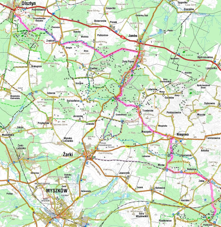 czerwony: Olsztyn k. Częstochowy – Sokole Góry – Zrębice – Złoty Potok – Piszczków – Trzebniów – Niegowa – Bobolice – Rezerwat Góra Zborów ok. 11 h (w obie strony)