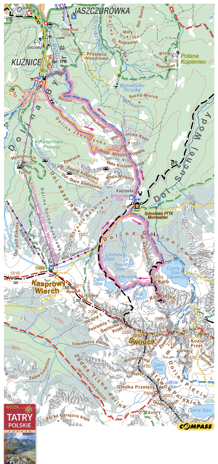 żółty, niebieski: Kuźnice – Dolina Jaworzynki/Boczań – Hala Gąsienicowa 2 h 15 min. ↑ 1 h 45 min.