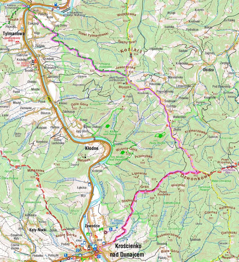 Schodząc z Koziarza, wracamy do rozwidlenia szlaków. Tym razem wędrujemy prosto na południe za żółtymi znakami, aby nad Krościenkiem połączyć się z czerwonym Głównym Szlakiem Beskidzkim. Droga prowadzi dokładnie granicą Popradzkiego Parku Krajobrazowego.