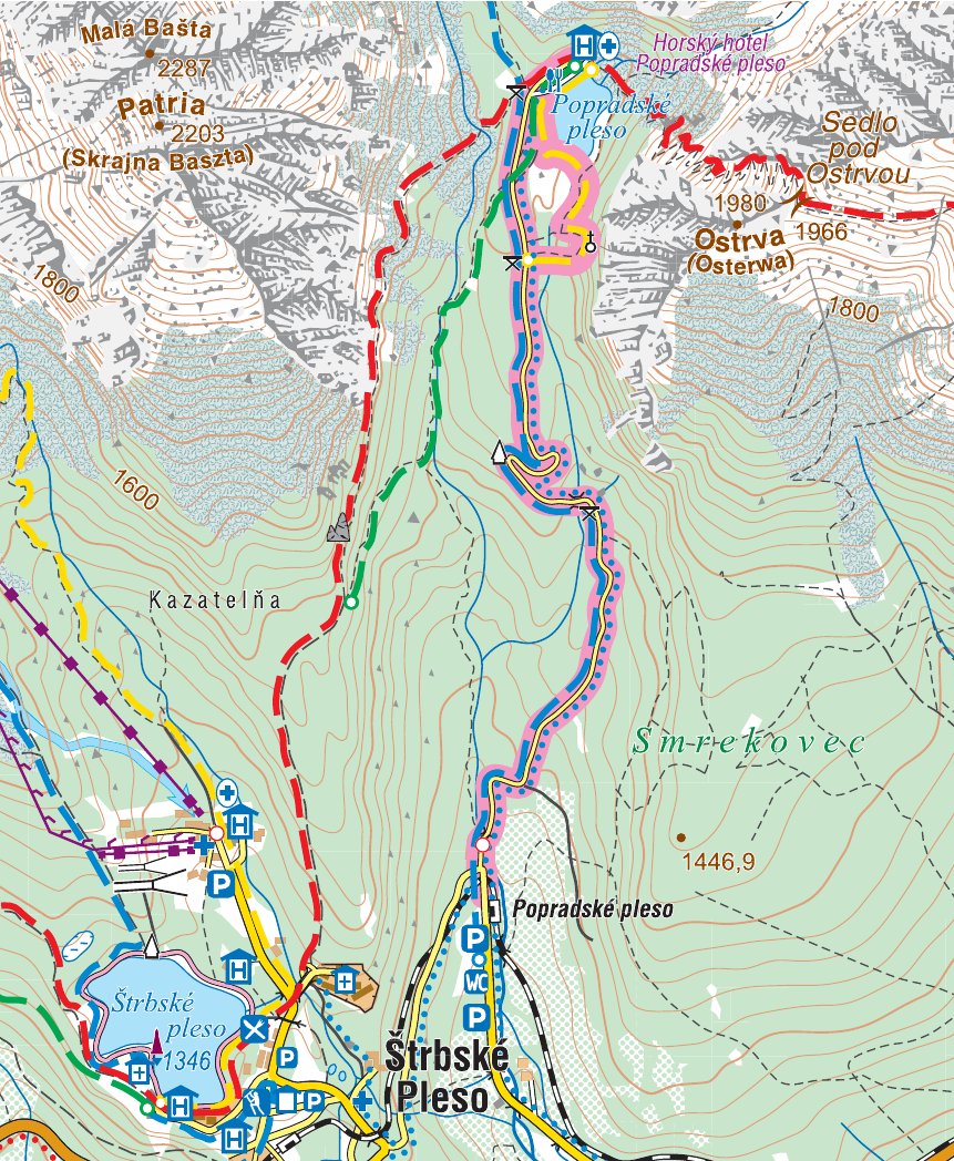 czerwony (Tatrzańska Magistrala, czynny jesienią i zimą, jeśli warunki atmosferyczne pozwalają): Popradské pleso - Sedlo pod Ostrvou (Przełęcz pod Osterwą) Batizovské pleso (Batyżowiecki Staw), Sliezsky dom (Dom Śląski) 4 h 45 min ↓↑