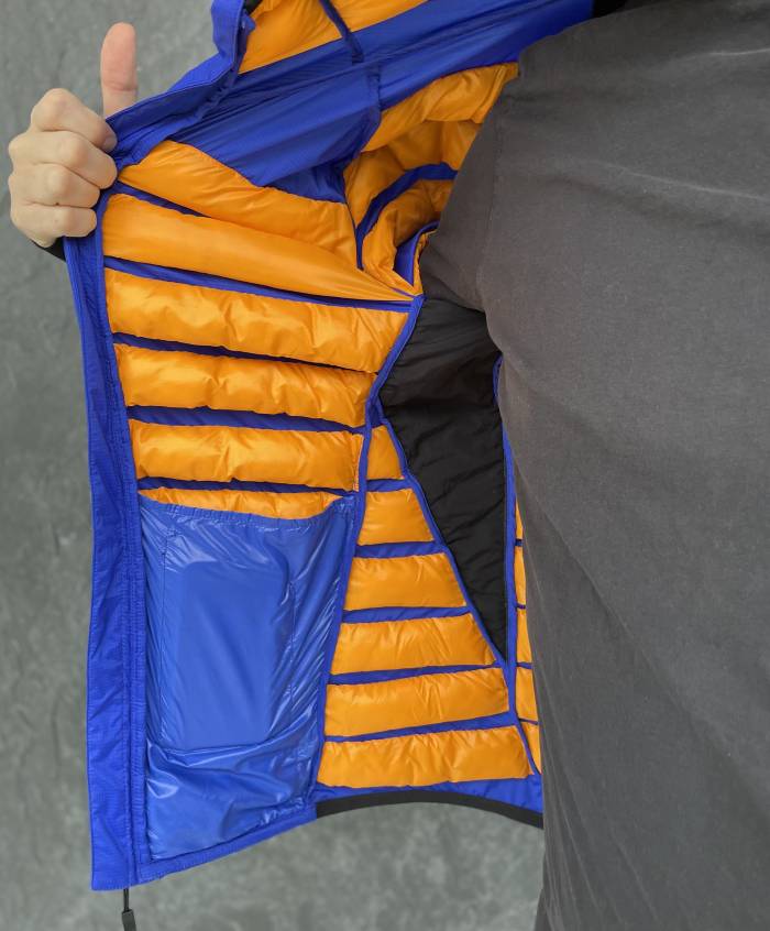 Z zewnątrz kurtka nie wyróżnia się znacząco, choć jest oczywiście bardzo dobrze wykończona. Naprawdę zadbano o każdy detal. Emocje, przynajmniej u mnie, budzi wewnętrzna strona. Pierwsze skojarzenie to zebra albo dżdżownica. Otóż całość łącznie z kapturem pokryta jest podłużnymi komorami z puchowo-syntetycznym wypełnieniem ułożonymi równolegle, której jednak nie są razem zszyte. Pomiędzy komorami jest wolna przestrzeń. Zapewnia ona dobrą wentylację oraz sprawne odprowadzanie nadmiaru ciepła i wilgoci.