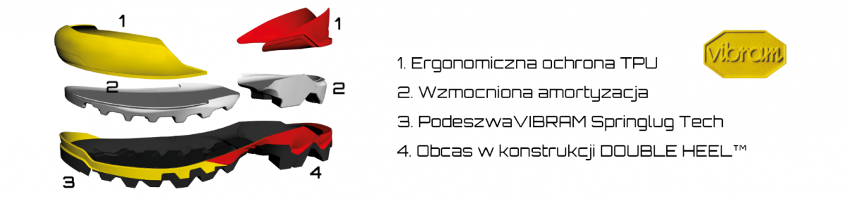 Charakterystyczny masywny obcas wykonany w technologii Double Heel™ gwarantuje lepsze hamowanie na zejściu i wsparcie przetoczenia stopy w trudnym terenie. Za dobrą przyczepność podeszwy odpowiada guma od Vibram® oraz masywne klocki bieżnika rozstawione w systemie Impact Brake System.