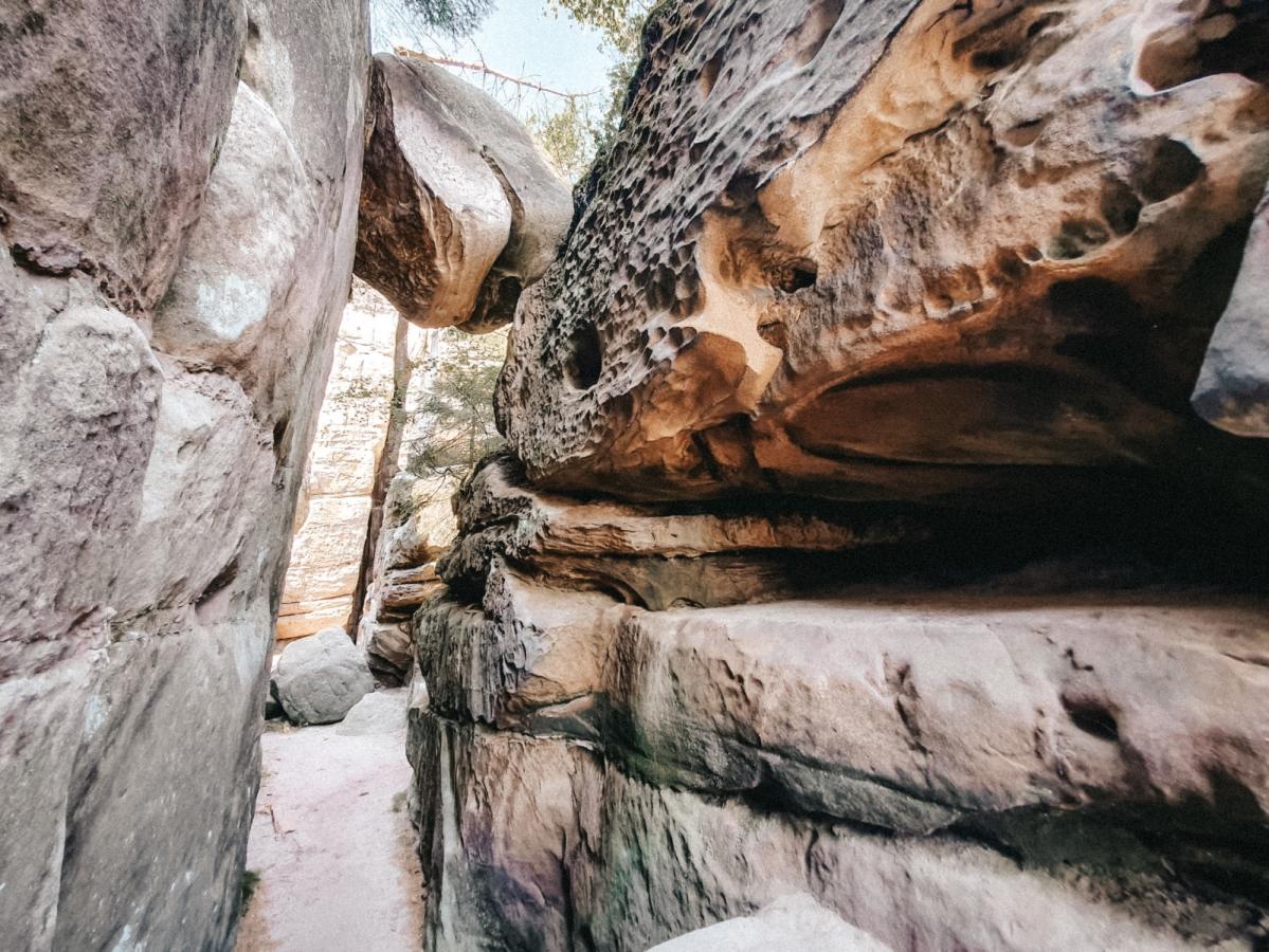I tak chodząc po Skalnych Czeskich Miastach, stajemy się widzami w ogromnym, naturalnym muzeum ziemi. Moje zmysły od dawna rozpalają też stare oznakowania szlaków, mozolnie kute w piaskowcowych skałach oraz wąskie stopnie. Nie wspominając już o tak charakterystycznej atrakcji Adrspachu, jak wąska Brama Gotycka wybudowana w 1839 roku rozkazem Ludwika Karela Nádhernego. To właśnie w tym miejscu znajdował się pierwotny wstęp do skał, a za bramą do dziś rozciąga się sieć chodników, mostów, kładek i schodków. To spektakularne miejsce, które wąskim gardłem wciąga wszystkich do środka labiryntu.