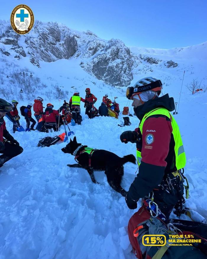 Natychmiast na miejsce poleciał śmigłowiec z pierwszą grupą ratowników i psami lawinowymi.