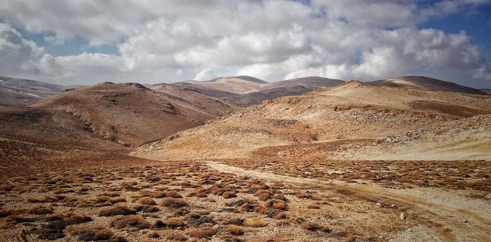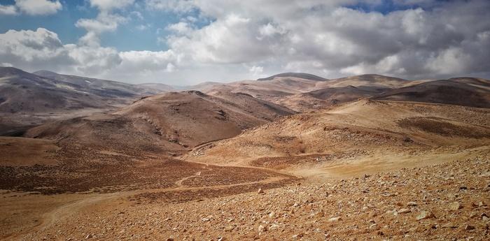 Stoję wśród spękanych wzgórz. Jestem na innej, bo pustynnej, planecie. Rzucam kolejne spojrzenie na krajobraz. Skalne wychodnie, kilka głazów w najróżniejszych konfiguracjach, zakłócają porządek regularnych pagórków. Wokół mnie piaskowo skalne bryły wygładzone wiatrami, gdzieniegdzie pojedyncze kamienie i kępy sztywnych traw. Z tej kamiennej koronki wypływa pod niebo bukiet wyboistych kopców. Wszędzie spadziste pagórki, strome formacje z miękką skałą osadową i twardym wapieniem. W oddali góry odcinają się od szkarłatnego pyłu. Gdzieś za tą linią jest Syria.