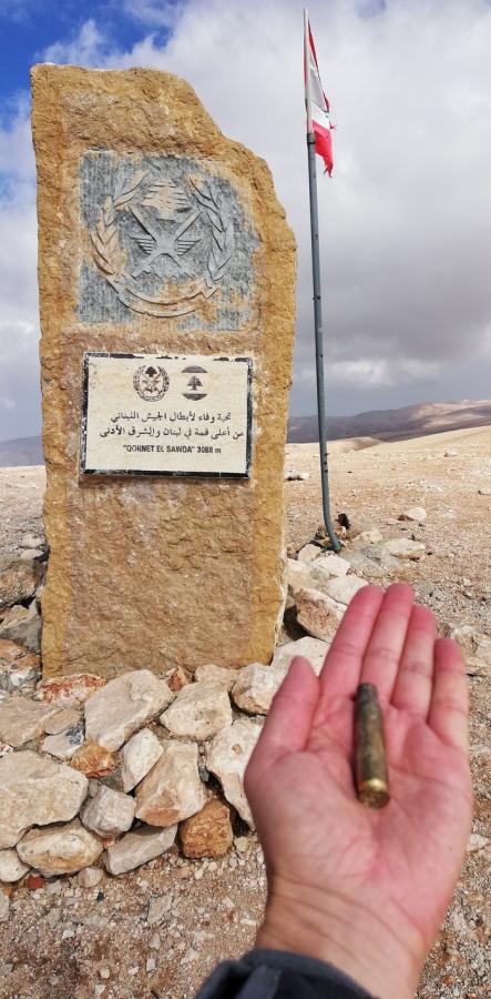 Spoglądam na tablicę pamiątkową zamontowaną w 2019 roku. Wcześniejsza, z czarną płytą, została zamalowana w akcie zwykłego wandalizmu. Jest hołdem dla bohaterów armii libańskiej, bo to najwyższy szczyt w Libanie i na Bliskim Wschodzie - Qurnat as Sawda 3088 m. Powyżej arabskich znaków graficznych dostrzegam godło libańskich sił zbrojnych. To narodowe drzewo cedrowe otoczone liśćmi laurowymi, umieszczone nad misternie połączonymi ze sobą dwoma bagnetami, parą skrzydeł i kotwicą, reprezentującymi odpowiednio: siły lądowe, powietrzne i marynarkę wojenną.
