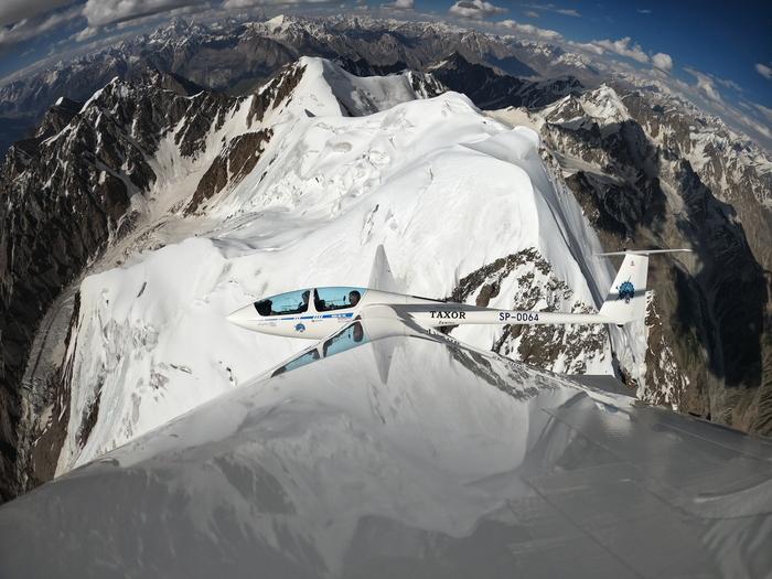 Tak, z Sebastianem Lampartem. Oficjalnie i w czystym stylu, bo 130 km z lotniska w Skardu pokonaliśmy bez użycia silnika. Wznosiliśmy się najpierw z wykorzystaniem zjawiska termiki, a potem zjawiska fali, przy wietrze wiejącym z prędkością 105 km/h. Falę wywołała góra K1, czyli Maszerbrum (7821 m n.p.m.). To zjawisko rzeczywiście przypomina falę, która tworzy się za przeszkodą w wodzie. K1 pomogło nam więc wzlecieć nad K2 (8611 m n.p.m.).