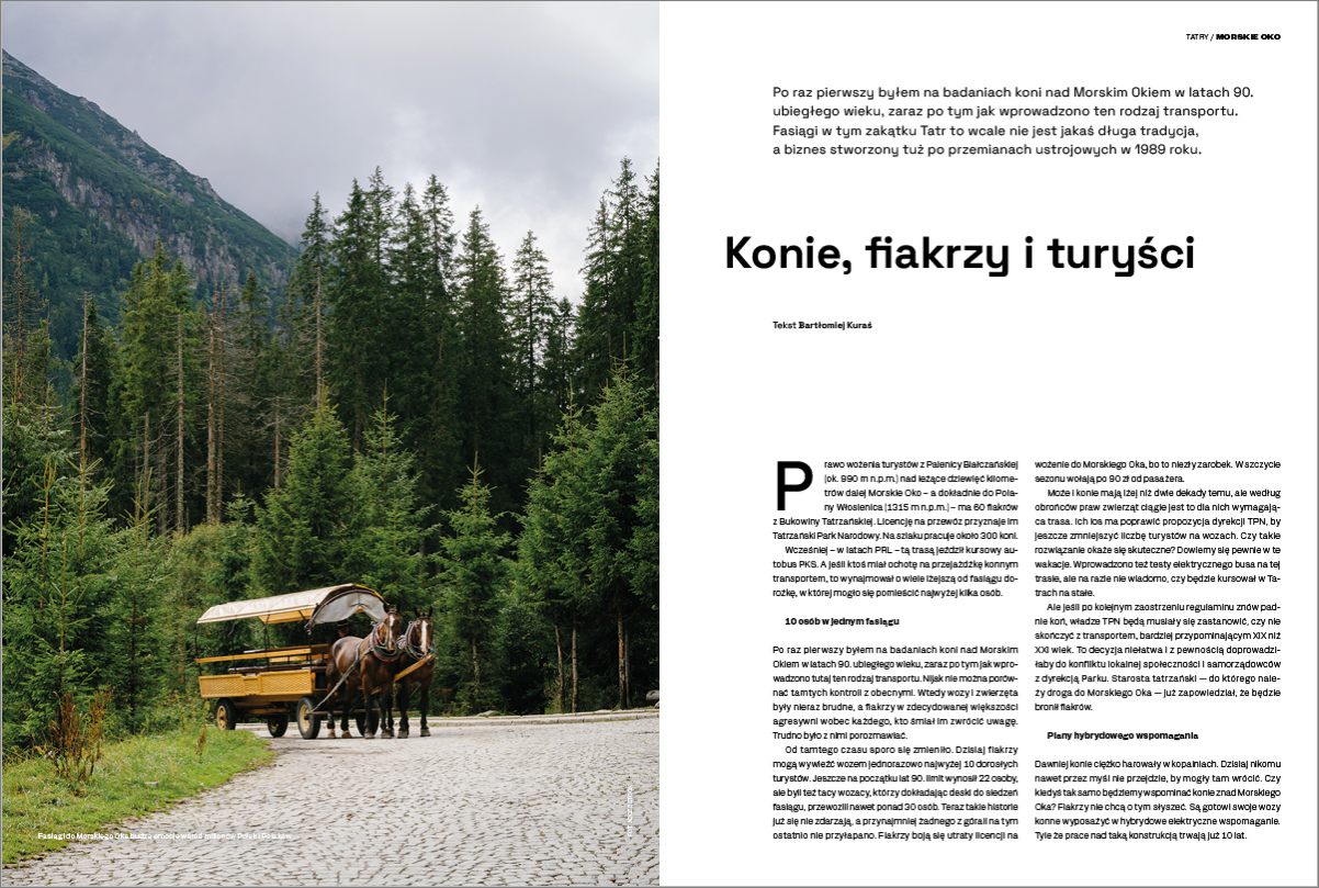 Niestety, o przeróżnych testach ekologicznych pojazdów donoszą tylko media, a decyzji nie ma i nie ma się co łudzić – nigdy jej nie będzie. Jak to się mówi: lobbing lokalsów jest zbyt silny. Bartłomiej Kuraś w tym numerze „Na Szczycie” przypomina historię tego sporu i nie ma co wierzyć w jego zakończenie. W połowie trzeciej dekady XXI w. zgadzamy się w milczeniu (pomijając grupy krzyczących głośno aktywistów) na cierpienie koni ciągnących wozy z leniwymi turystami, bo decydentom brak odwagi.